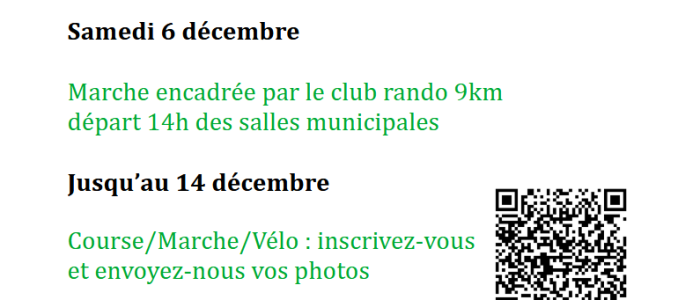 Le Téléthon revient le 6 décembre ! Avec plusieurs actions – dès maintenant et jusqu’au 14 décembre, des courses, marches et du cyclisme virtuel. Inscrivez-vous par le lien et envoyez-nous vos photos. https://forms.registration4all.com/…/Register_Sport… – le 6 décembre après-midi, une rando entre 8 et 10 km organisée par le club rando. …